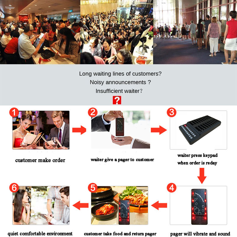 4) يحصل الضيف على الإشارة اللاسلكية عن طريق جهاز النداء بالاهتزاز أو وميض الصمام أو الرقم مع رقمهم ، والذهاب إلى العداد لأخذ طلبه.