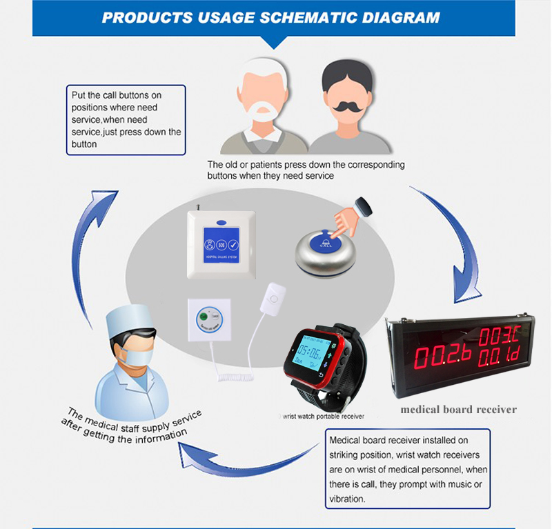 يستخدم نظام استدعاء ممرضات المستشفيات على نطاق واسع في المستشفى ؛ العيادة ؛ كبار السن المنزل وهلم جرا. ممرضة استدعاء الجرسيتكون من زر لـ استخدام المريض ومستقبل الإشارات ممرضة أو طبيب استخدام. متى يحتاج المريض إلى أي مساعدة ، هم فقط اضغط على الزر ، سيظهر رقم السرير على جهاز استقبال شاشة العرض مع "dingdong" صوت. حتى تتمكن الممرضة والطبيب تقديم المساعدة في الوقت المناسب.