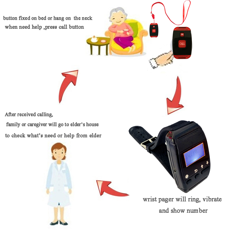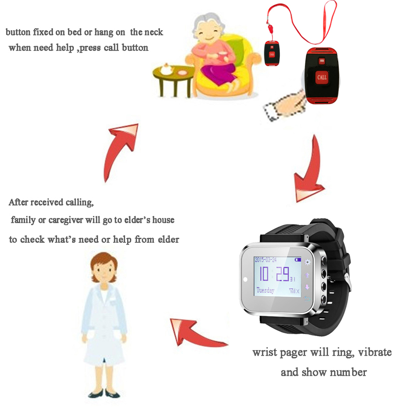 1. الإعداد البسيط ، سهلة الاستخدام. عندما تحتاج إلى مساعدة ، فقط اضغط على زر الاتصال دون الصراخ. سيكون النداء يمكن ارتداؤها تهتز أو جعل الضوضاء في حالة تأهب. تنبيه فقط مقدم الرعاية التحول ليلا ، لن يستيقظ الآخرين.