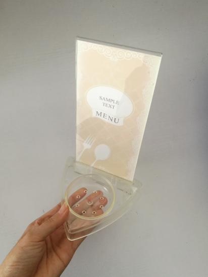 حامل القائمة مادة الاكريليكحامل القائمة الاكريليك يمكن أن يحمل بطاقة القائمة أو إعلان K - SS حامل القائمة يمكنه تثبيت الزر في فتحة القاعدة ، لا يمكن مسروق بسهولة.