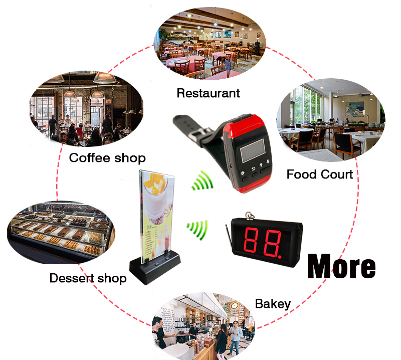 عندما يحتاج الضيف إلى مساعدة ، يمكنه الضغط على زر الاتصال الموجود على الطاولة. سيتم إرسال هذه الإشارة إلى جهاز الاستقبال ، مثل ساعة النادل وشاشة الأرقام على الحائط. سيذهب النادل للخدمة في الوقت المناسب إذا سمع المطالبة بالصوت أو الاهتزاز.