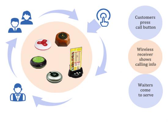 يستخدم نظام الاتصال اللاسلكي على نطاق واسع في منطقة الخدمة. يتكون من زر طاولة لاستخدام الضيف وجهاز استقبال إشارة لاستخدام النادل أو النادلة. عندما يحتاج الضيف إلى أي خدمة ، ما عليك سوى الضغط على الزر القريب منه أو عليها ، وسيظهر رقم مكتبه على جهاز الاستقبال مع موسيقى تنبيه أو صوت. لذلك يمكن للنوادل تقديم الخدمة في الوقت المناسب جدًا.