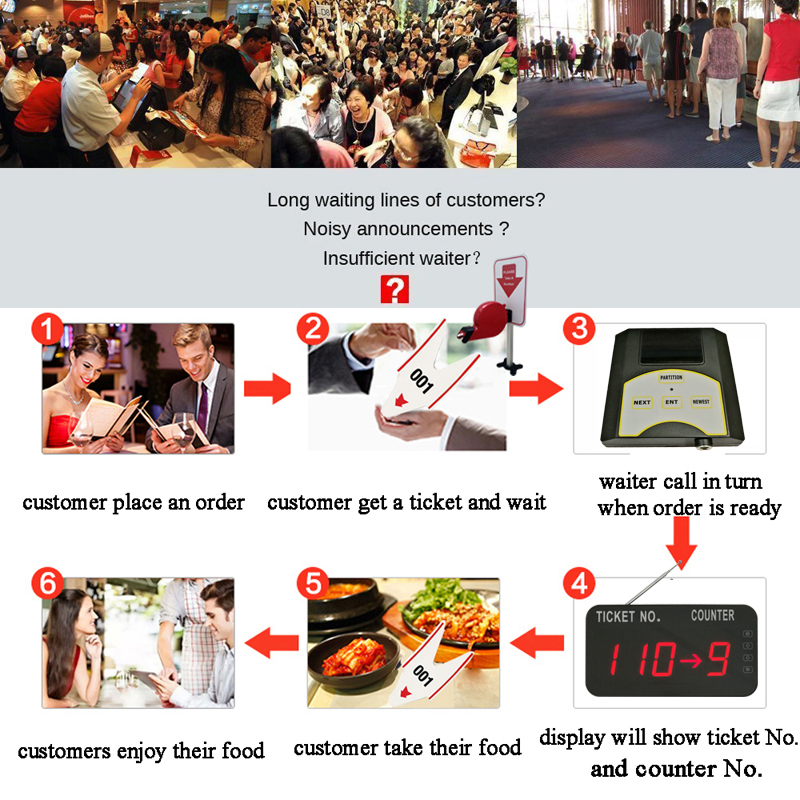 يمكن أن تعرض قائمة الانتظار 3 أرقام لعرض رقم التذكرة ورقم واحد لرقم العداد تقليل تكلفة عناصر الخدمة تقليل تكاليف العمالة المرتبطة بالنادل وعداء الطعام. زيادة الإيرادات والأرباح