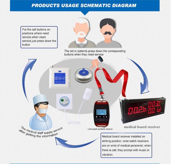 يستخدم نظام استدعاء ممرضة المستشفى على نطاق واسع في المستشفى ؛ العيادة ؛ منزل المسنين وهلم جرا. يتكون من زر لاستخدام المريض وجهاز استقبال الإشارة للممرضات أو الطبيب. عندما يحتاج المريض إلى أي مساعدة ، يقوم فقط بالضغط على الزر ، وسيتم عرض رقم السرير على جهاز استقبال شاشة العرض بصوت "dingdong". لذلك يمكن للممرضة والطبيب تقديم المساعدة في الوقت المناسب.