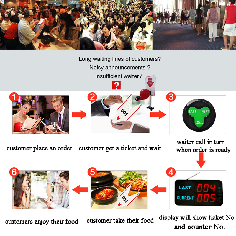 كيف تأخذ عمل نظام الأرقام: إعطاء رقم تسلسلي رقمي في غضون 999 للعملاء ، عندما يكون النظام جاهزًا فقط اضغط على الرقم الذي تريد الاتصال به ، ستظهر الشاشة اللاسلكية بصوت مصحوب برقم عرض على الشاشة ، وسهلة لتنبيه الضيوف بأن طعامهم جاهز ، عملية سهلة الاستخدام .