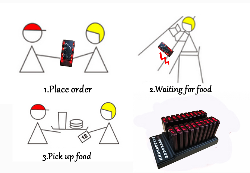 يستخدم نظام بيجر ضيف المطعم بشكل رئيسي في مطاعم الوجبات السريعة ، ومطعم الخدمة الذاتية ، والعيادة ، والمستشفى ، ومقهى الشاي ، والمكتب ، وما إلى ذلك ، أين هناك الكثير من العملاء ينتظرون الخاصة بهم خدمة. ال يتكون النظام من جهاز إرسال لوحة مفاتيح للمتصل وجهاز استقبال بيجر للشخص الذي سيتم استدعاؤه. متى المتصل جاهز لتقديم الخدمة ، هم الضغط على الرقم المقابل على لوحة المفاتيح لإرسال معرف إلى جهاز النداء. و سيعرف الأشخاص الذين يحملون البيجر المعلومات التي تفيد بأن الأطباق أو الخدمة جاهزة للتقديم ويأخذونها في وقت مبكر