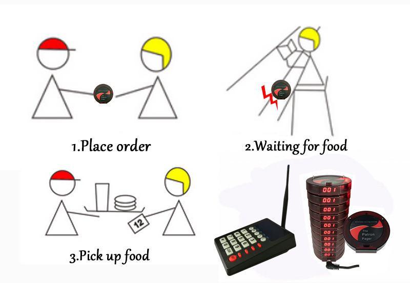 عندما يكون الطعام جاهزًا ، يمكن للمتصل ضغط الرقم المقابل على لوحة المفاتيح لإرسال معرف إلى جهاز استدعاء المطعم.