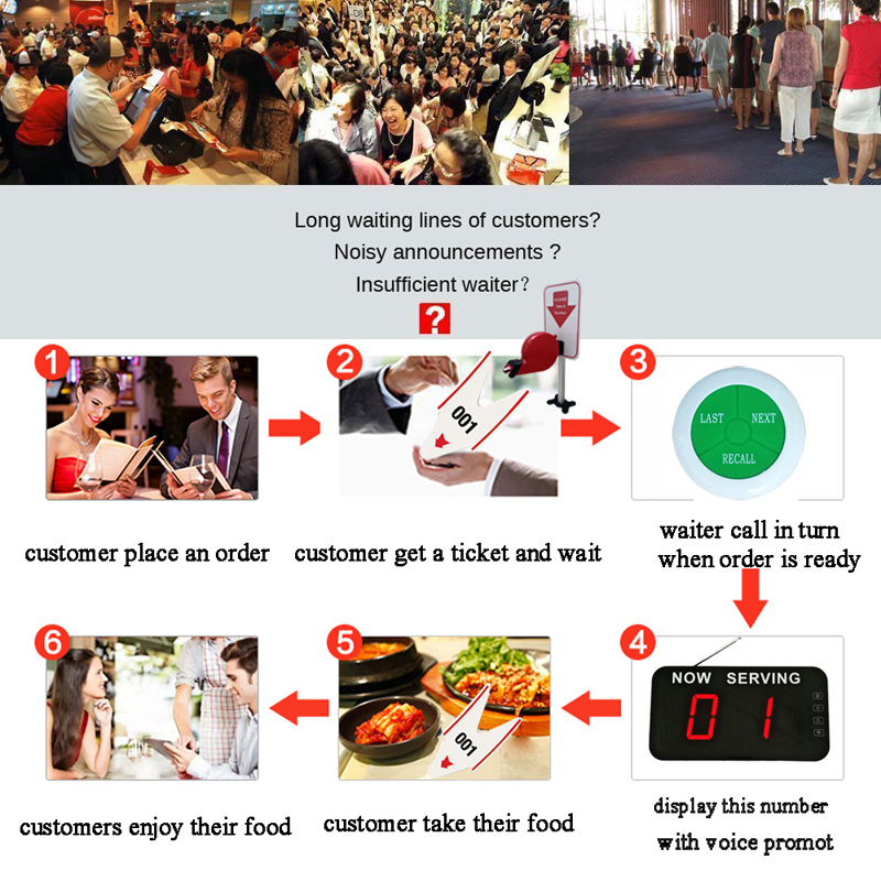 كيف تدير طابور البنوك الصغيرة النظام؟ إعطاء رقم تسلسلي رقمي ضمن 999 للعملاء ، عندما يكون النظام جاهزًا فقط اضغط على المفتاح التالي من الزر ، ستظهر الشاشة اللاسلكية بصوت مصحوب برقم (يبدأ الرقم من 01 أو 001 أو a01) ، ويحتاج إلى رقم الاتصال بدوره. سهلة لتنبيه الضيوف طعامهم جاهز ، عملية سهلة الاستعمال.