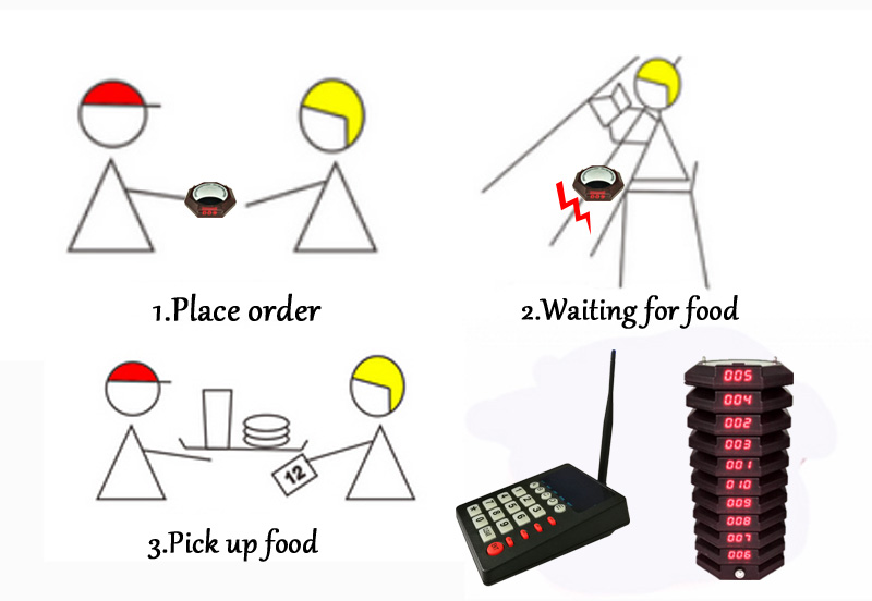 عندما يكون الطعام جاهزًا ، يمكن للمتصل ضغط الرقم المقابل على لوحة المفاتيح لإرسال معرف إلى جهاز استدعاء المطعم.